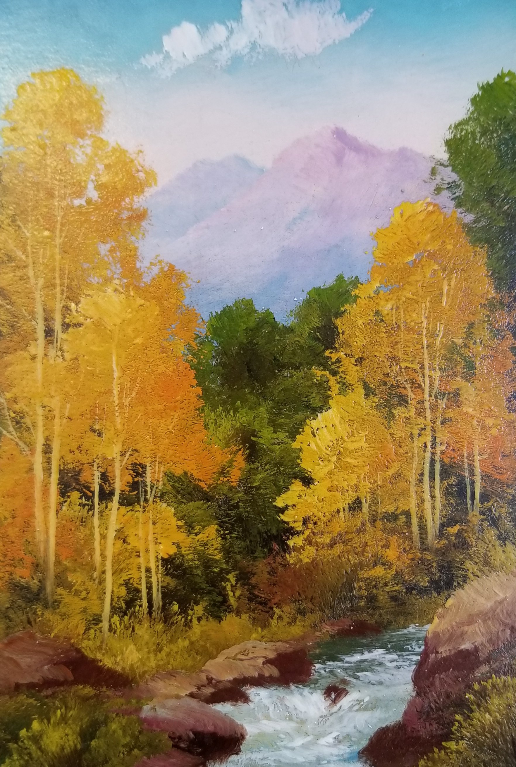 Painting after touch up of fleckked paint caused by frame pressure and adhesion and a coat of damar varnish.